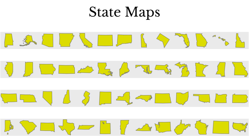- 50 State Maps: Available in yellow, white, and black variations, with outlined options.